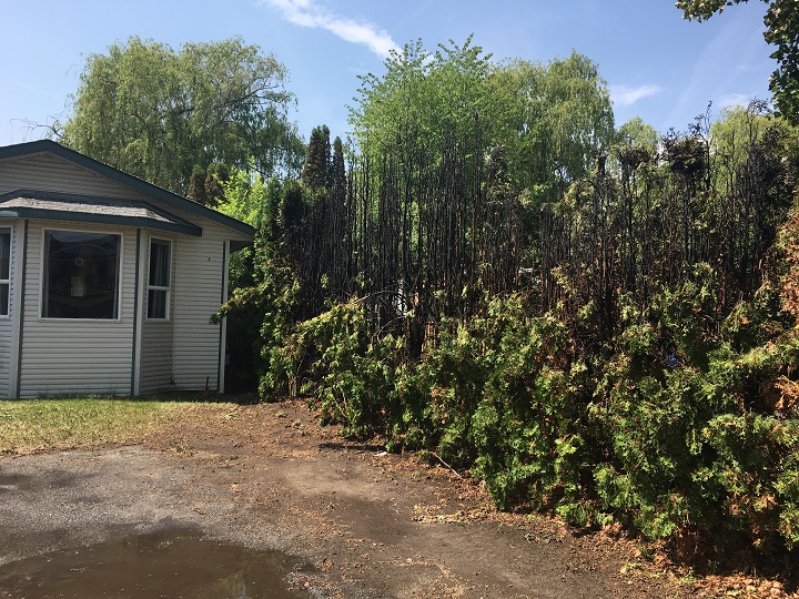 A hedge fire in a West Kelowna mobile home park that sparked to life on Friday morning came close to one unit before being put out.