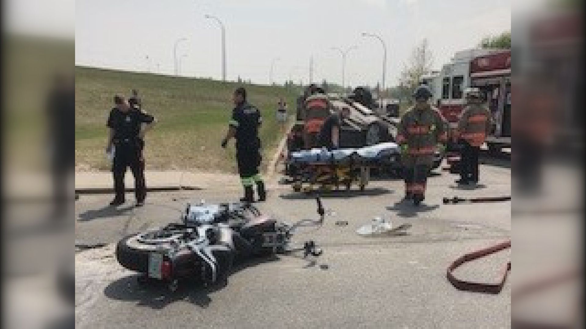 The vehicle was on its roof with one person trapped inside and the motorcycle was in the middle of the intersection when crews arrived, the Saskatoon Fire Department said in a release.