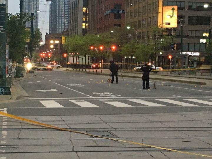 Officers arrived at Queen Street West and Spadina Avenue around 3 a.m. and found bullet holes in a building and multiple shell casings at the scene.