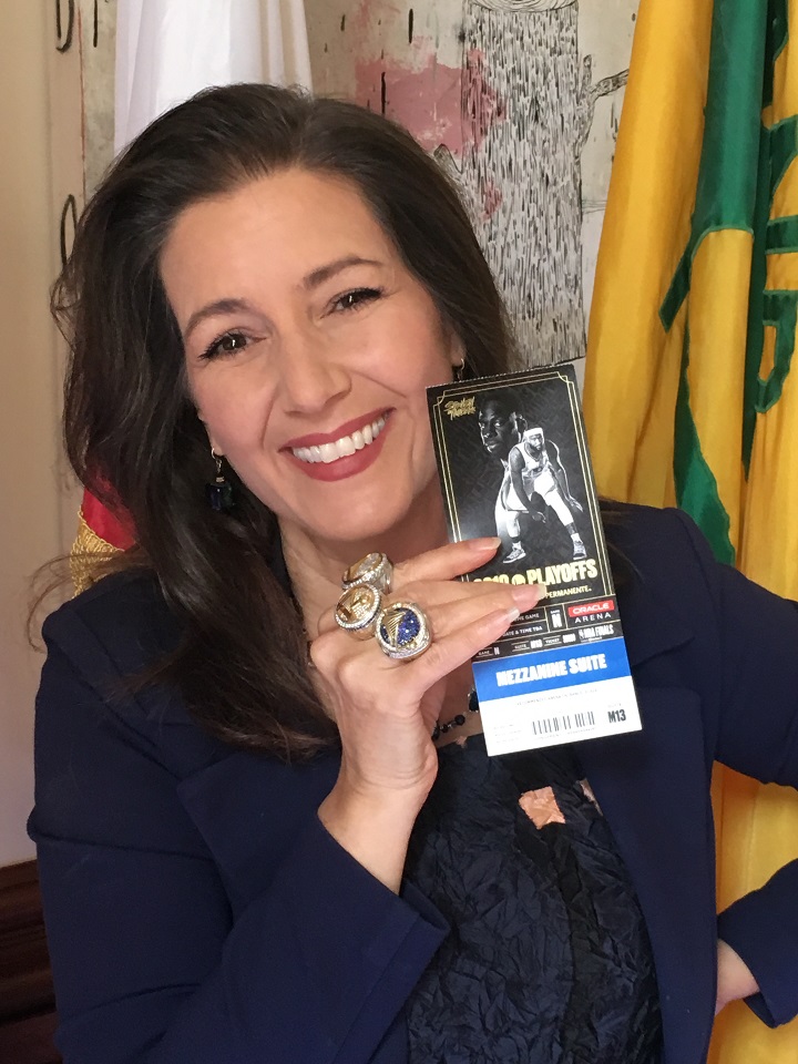 For an interview with Global News, Schaaf slipped on three chunky championship rings, gold and diamonds glinting in the Oakland sunshine. The personalized rings were given to the mayor by the Warriors organization to mark their recent wins.