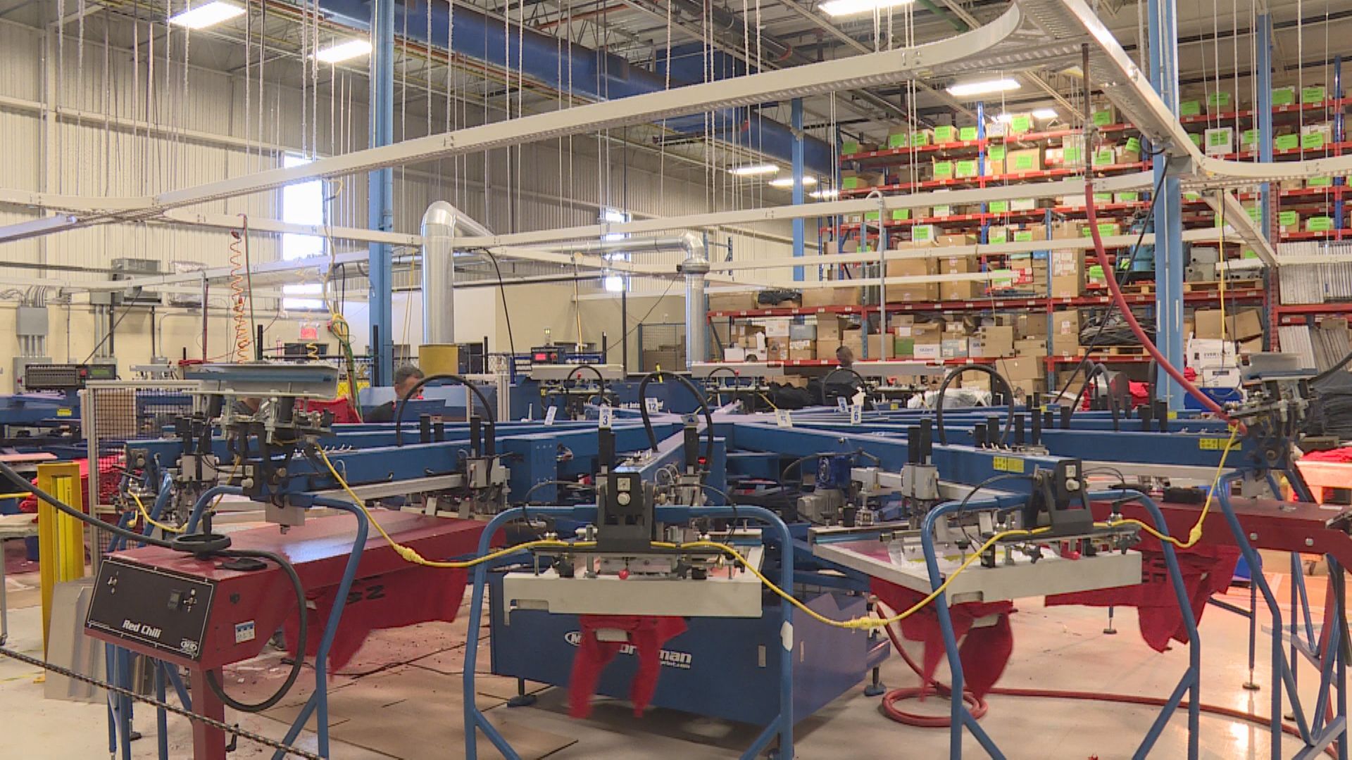 The company right across from Fairview Pointe-Claire produces Toronto Raptors apparel. Employees are working overtime to keep up with surging demand.