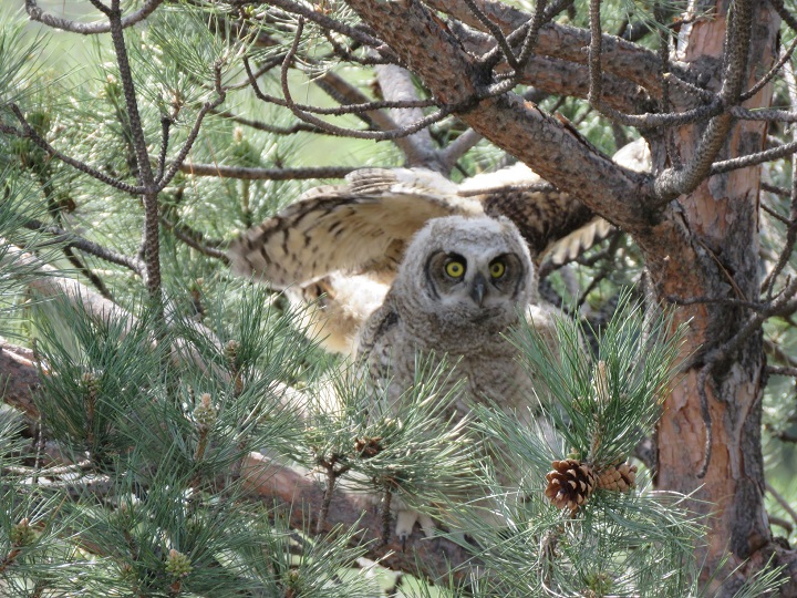 According to Lawlor, following days of getting ready for flight by flapping their wings, the fledglings were called over to the pole by the mother owl.