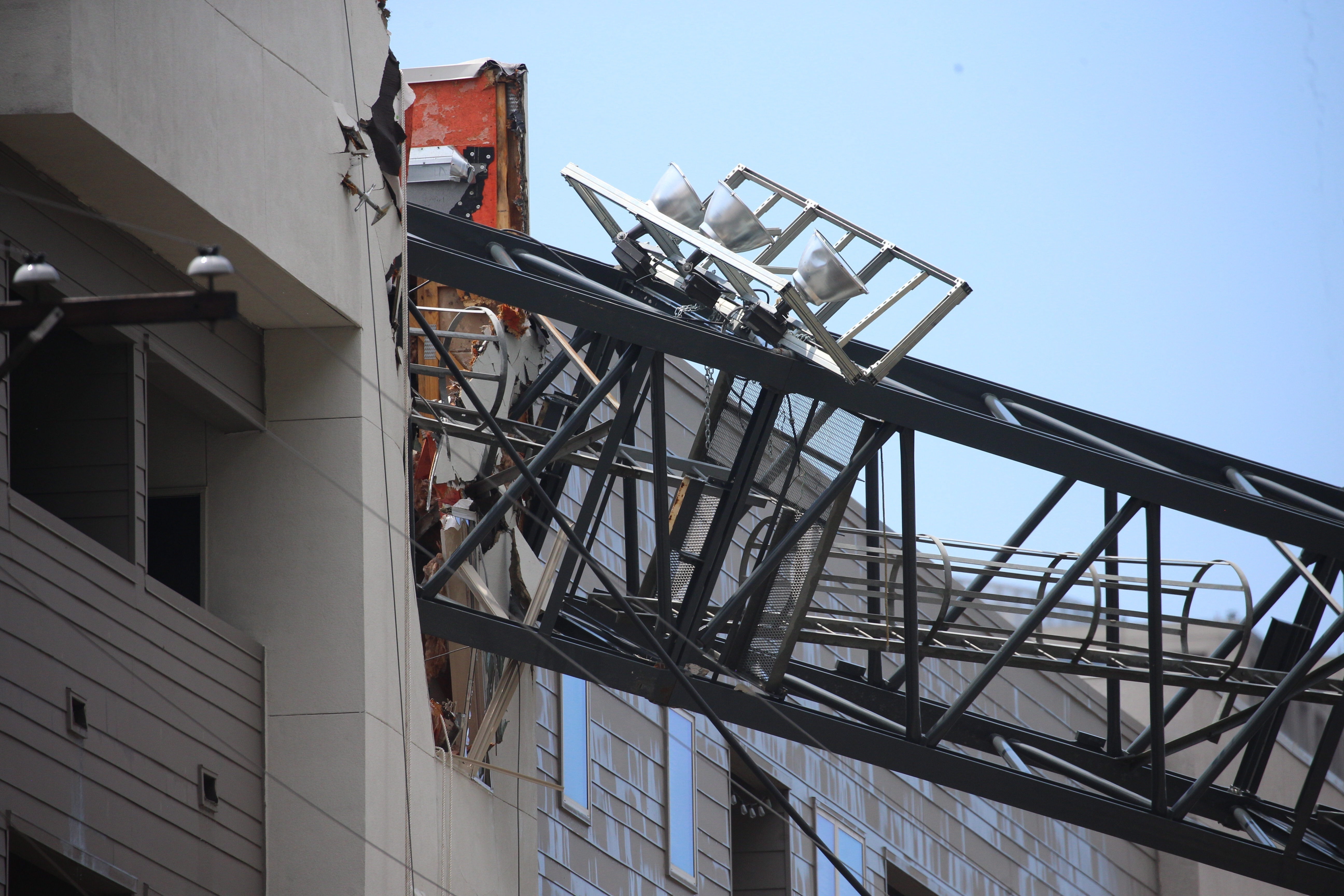 Video shows that downed crane ripped a large hole in the east side of the building and landed on an adjacent parking garage. Evans said the top priority for search and rescue personnel was the eastern side of the building where all five floors collapsed and where the deceased woman was found.