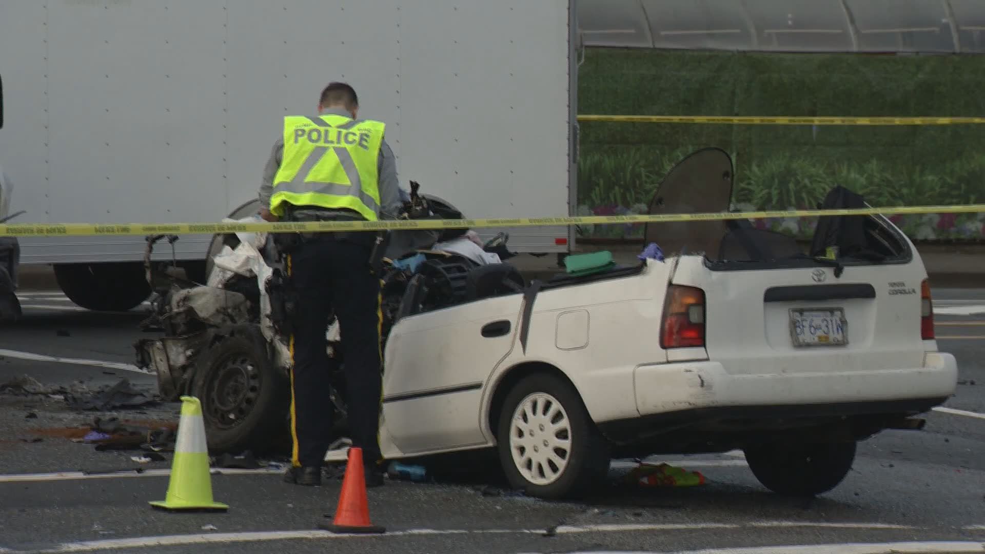 The scene of a serious car crash in Surrey that sent a driver to hospital with serious, "potentially life-altering" injuries in April, 2019. Global News