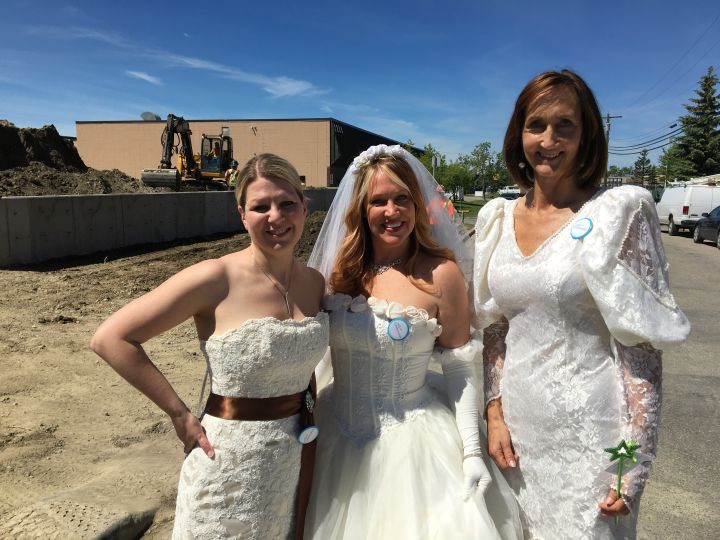 They’re donning their wedding dresses, wearing them around Calgary as they go about their regular activities, and joining together in a couple of group appearances as well.