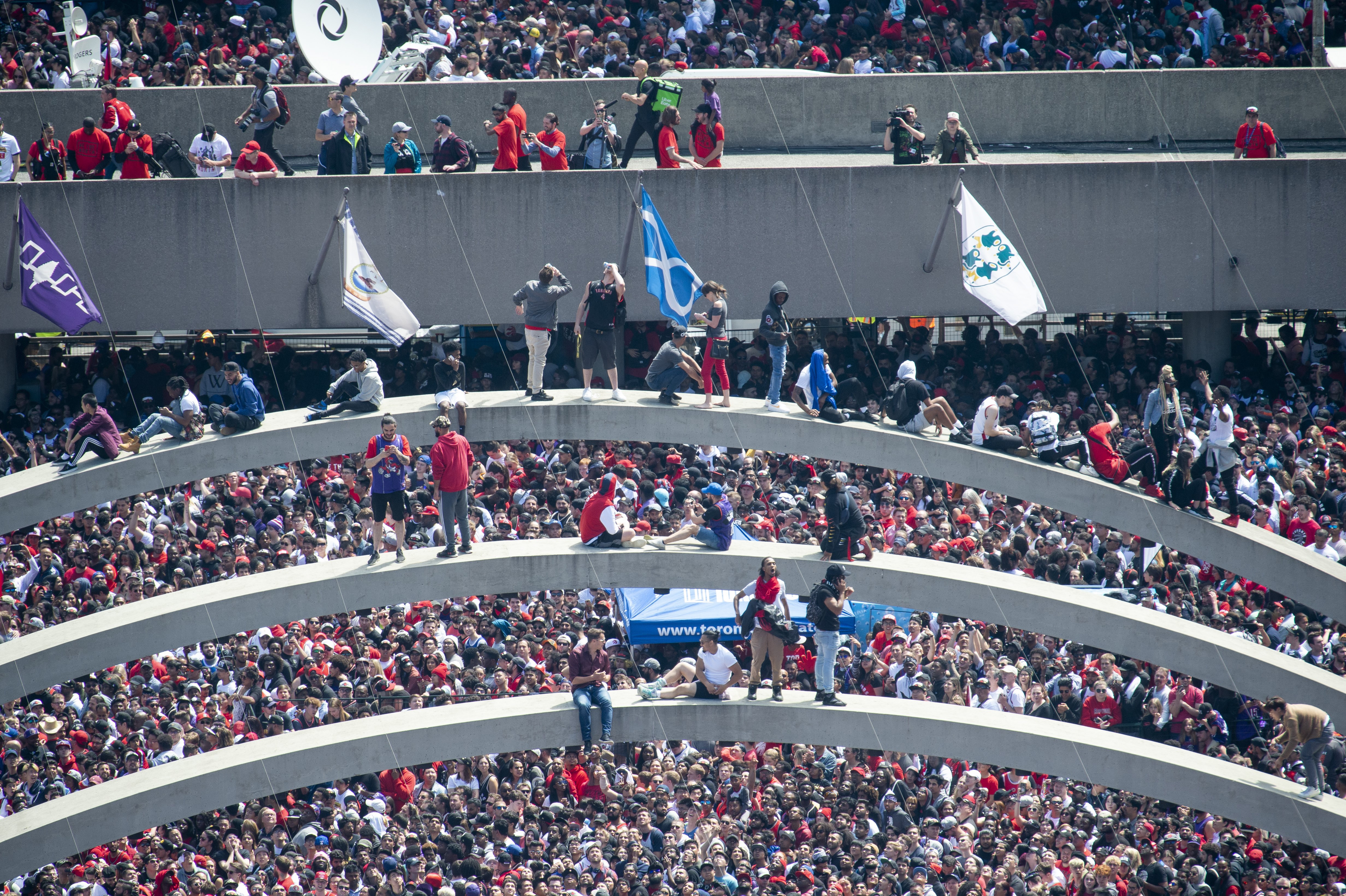 Several fans climbed the arches at Nathan Phillips Square to get a better vantage point. The festivities were put on pause while officials went on the loudspeaker to tell them to get down due to safety concerns.