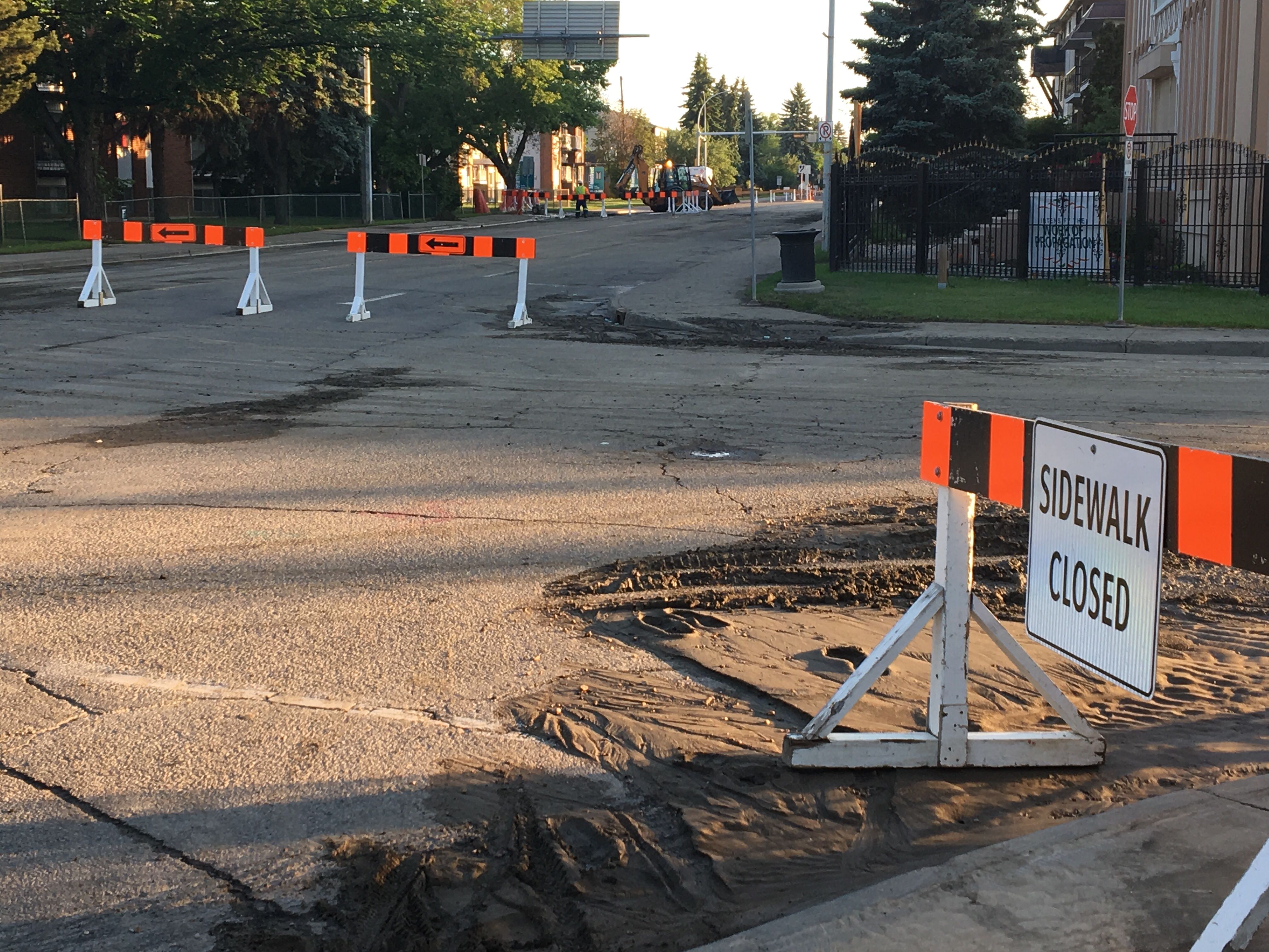 On Thursday morning, amid a rainfall warning in Edmonton, EPCOR said the street remained closed between 119 Avenue and 120 Avenue.