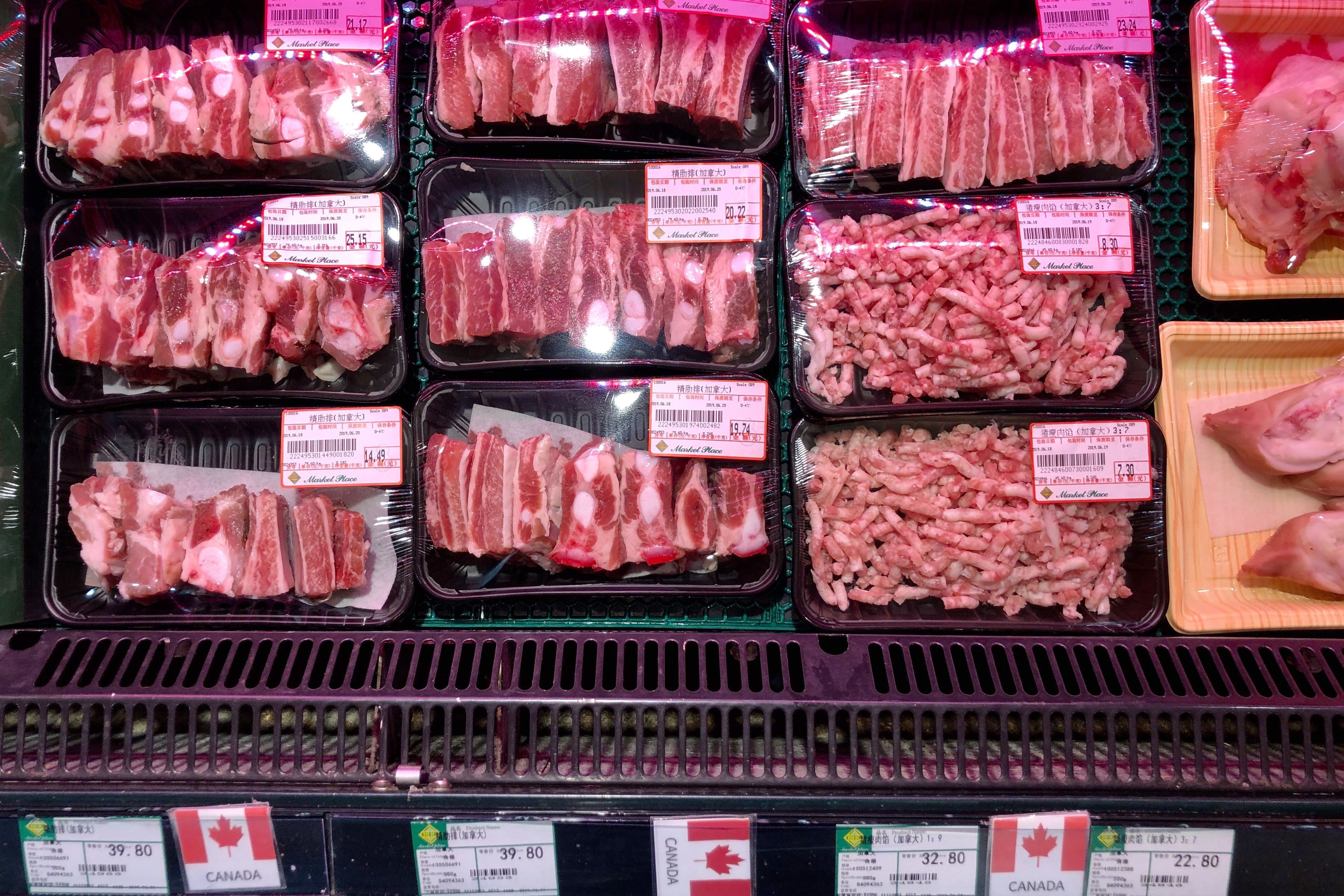 Packs of Canadian pork are displayed for sale at a supermarket in Beijing, Tuesday, June 18, 2019. (AP Photo/Andy Wong)