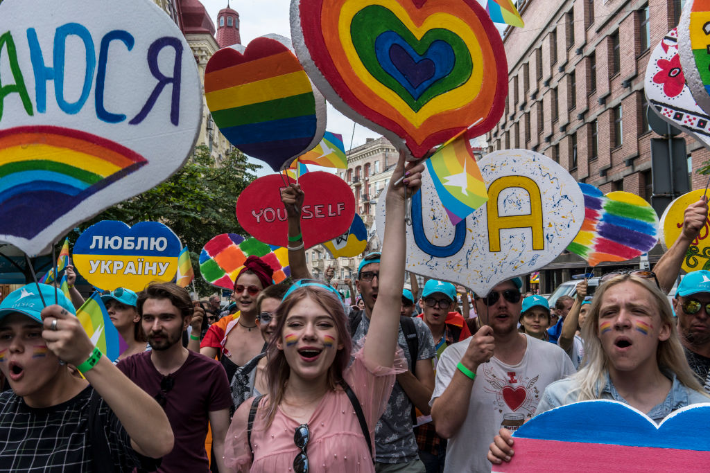 Crowds of people, many dressed in bright colours, paraded along streets in the centre of the Ukrainian capital, holding up banners saying “Diversity is beautiful”, “Human rights = happy country”, “No violence – yes rights!”.