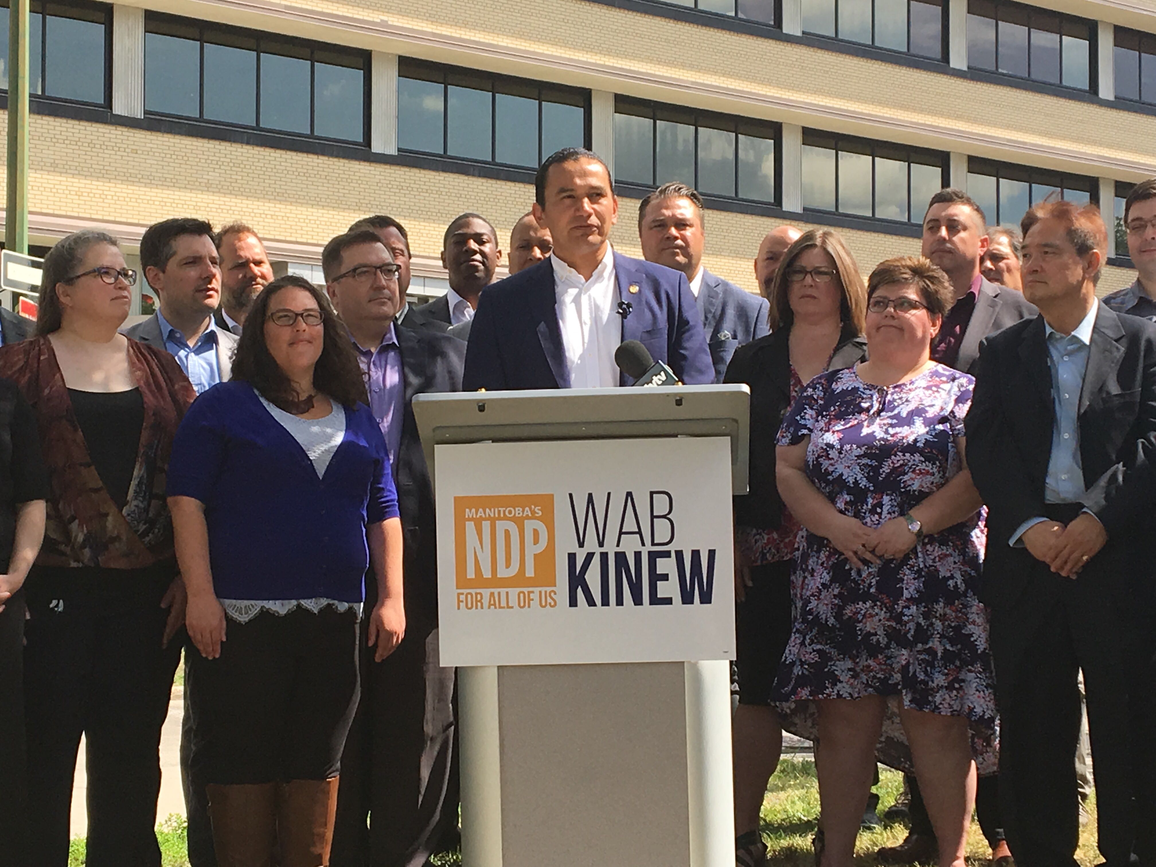 “Today I’m calling on Brian Pallister to move his government into caretaker mode until September 10th,” Kinew said with over a dozen New Democrat candidates standing behind him.