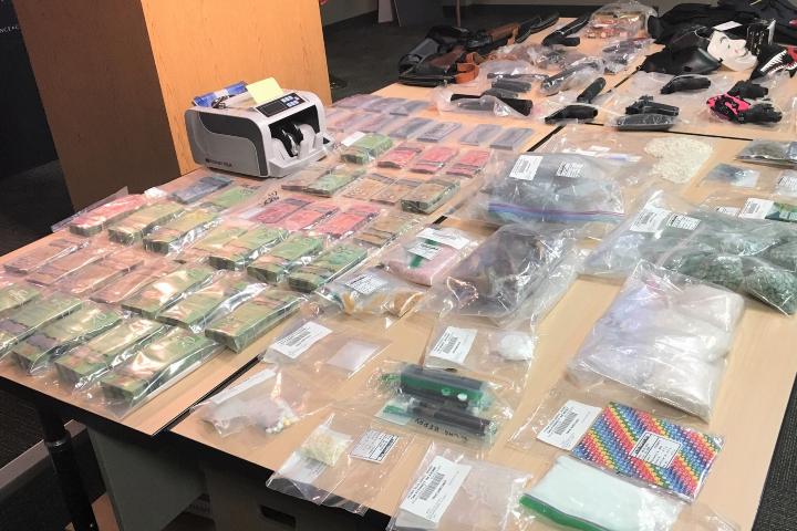 Calgary police say multiple guns and $137,000 worth of drugs were seized from a home in the downtown core earlier this week.