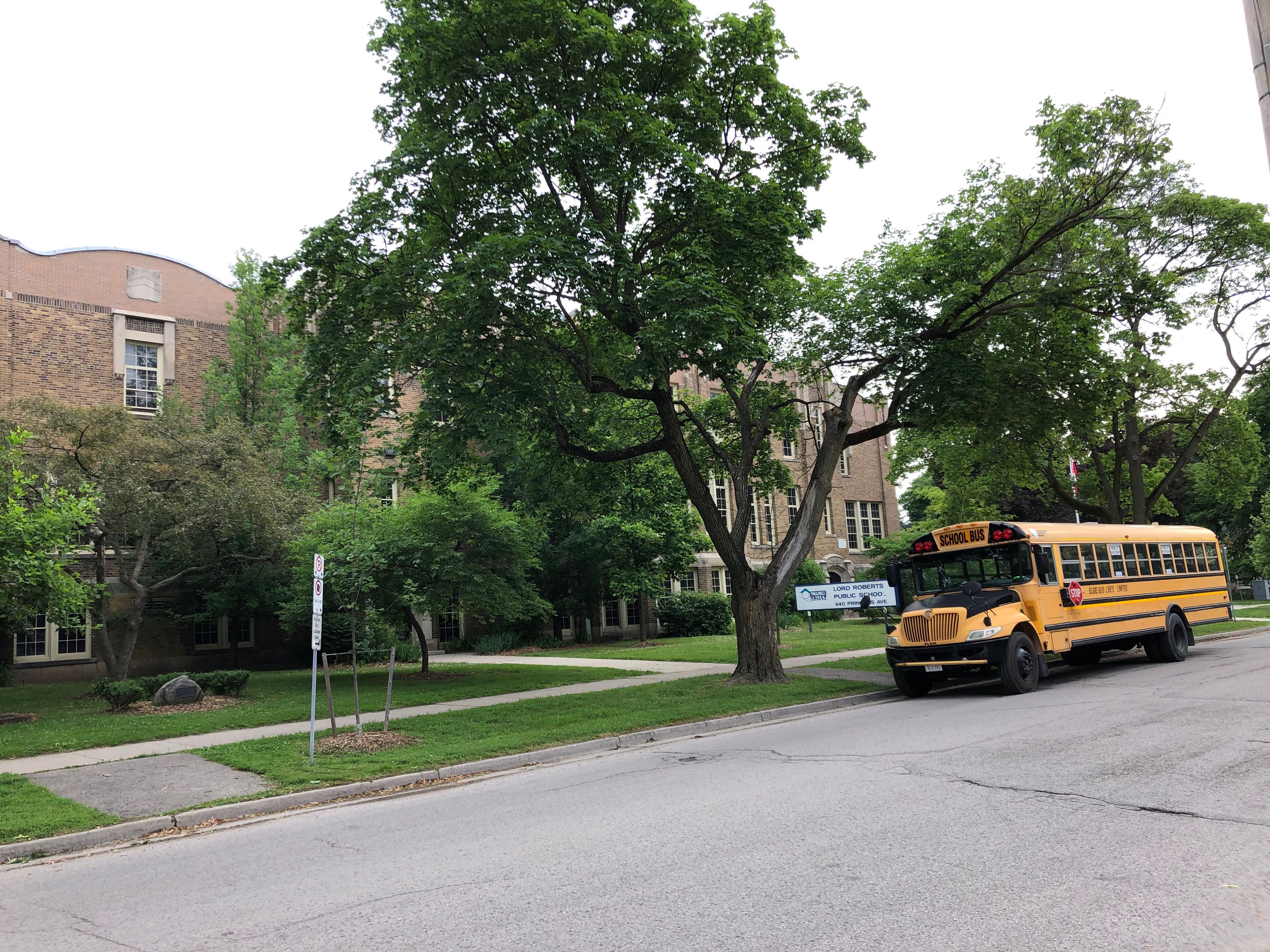 A school bus waits outside Lord Roberts French Immersion Public School on the last day before summer vacation. Andrew Graham / 980 CFPL