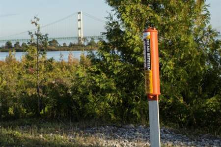 In this Sept. 23, 2015, file photo, the Mackinac Bridge is visible from a marker near Enbridge Line 5 on the northern shore of the Straits of Mackinac in Michigan. Neil Blake/The Grand Rapids Press via AP, File