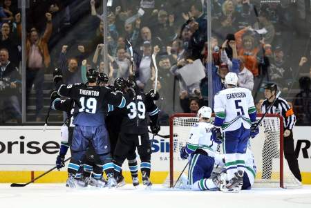 The move didn’t pay immediate dividends as Vancouver fell behind after the opening period for the third straight game. The Sharks struck quickly when Burns tipped in a point shot from Scott Hannan less than three minutes into the game.