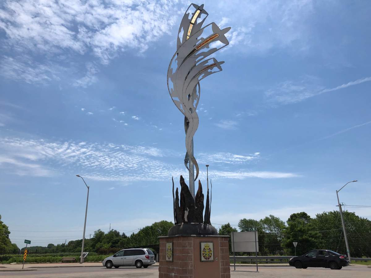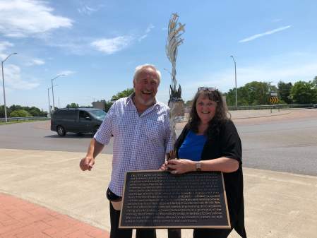 The memorial was co-created by metalwork artist Jerry Vrabec who owns Custom Art Metal Work on Swinyard Street. It is crafted from stainless steel and concrete, as well as tempered and enamelled glass.
