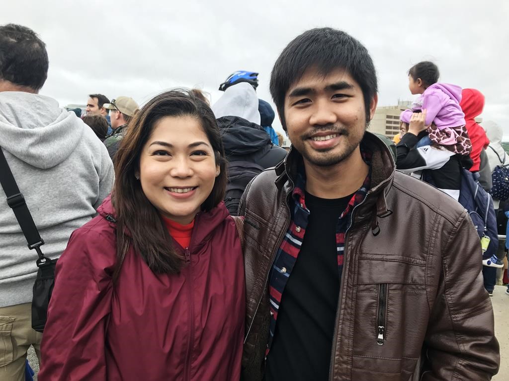 Jihan Estrella and Jeno Rigor, her husband recently immigrated from Philippines stand in the crowd.
