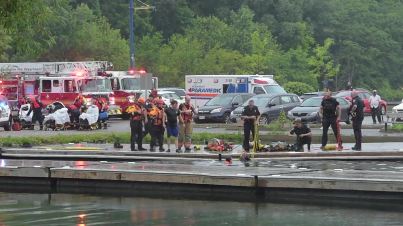 Halton police Const. Steve Elms says it’s believed the vehicle drove down the laneway at the marina, crashed through a barrier and a sign and then drove into the lake around 8 p.m., becoming “completely submerged” about 40 feet from the shoreline at LaSalle Park.