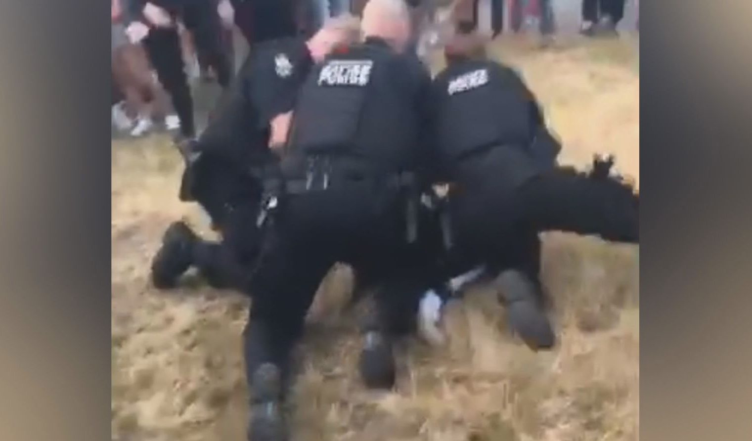 The video, which was obtained by Global News Friday, shows three West Vancouver police officers pinning down a shirtless youth while a large crowd of onlookers cheers the suspect on.