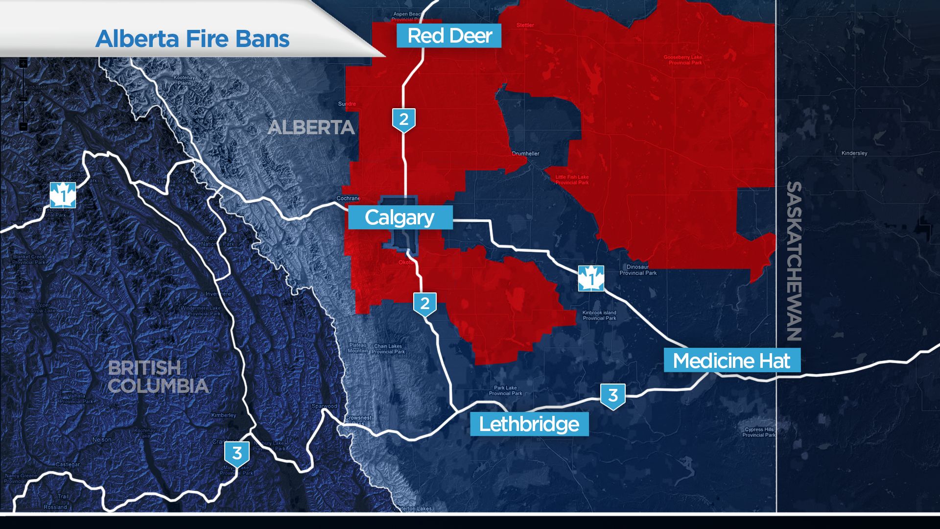 A number of fire bans are now in place, including Rocky View County which has upgraded their ban to level three, meaning no open fires are allowed. The city of Calgary is under a fire safety advisory.