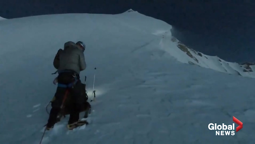 The brief video shows a mountainous landscape as the group appears to be taking a break. Then the video cuts to the group ascending a narrow ridge leading towards a snowy peak, roped together as they gingerly step upwards. Then, in a heart-dropping moment, the screen goes blank.