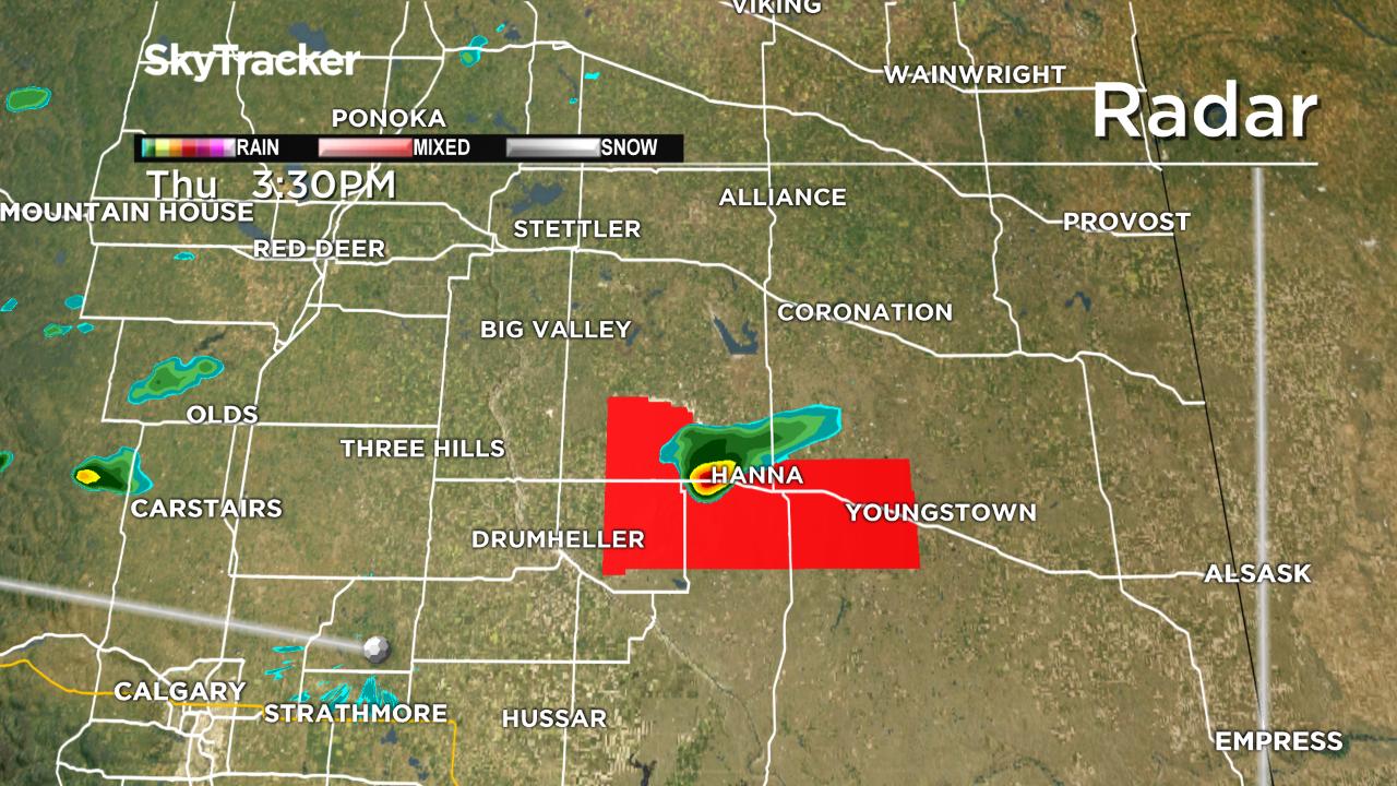 Environment Canada issued a severe thunderstorm warning at 3:36 p.m. Thursday for parts of southern Alberta, including Starland County and areas near Hanna and Richdale.