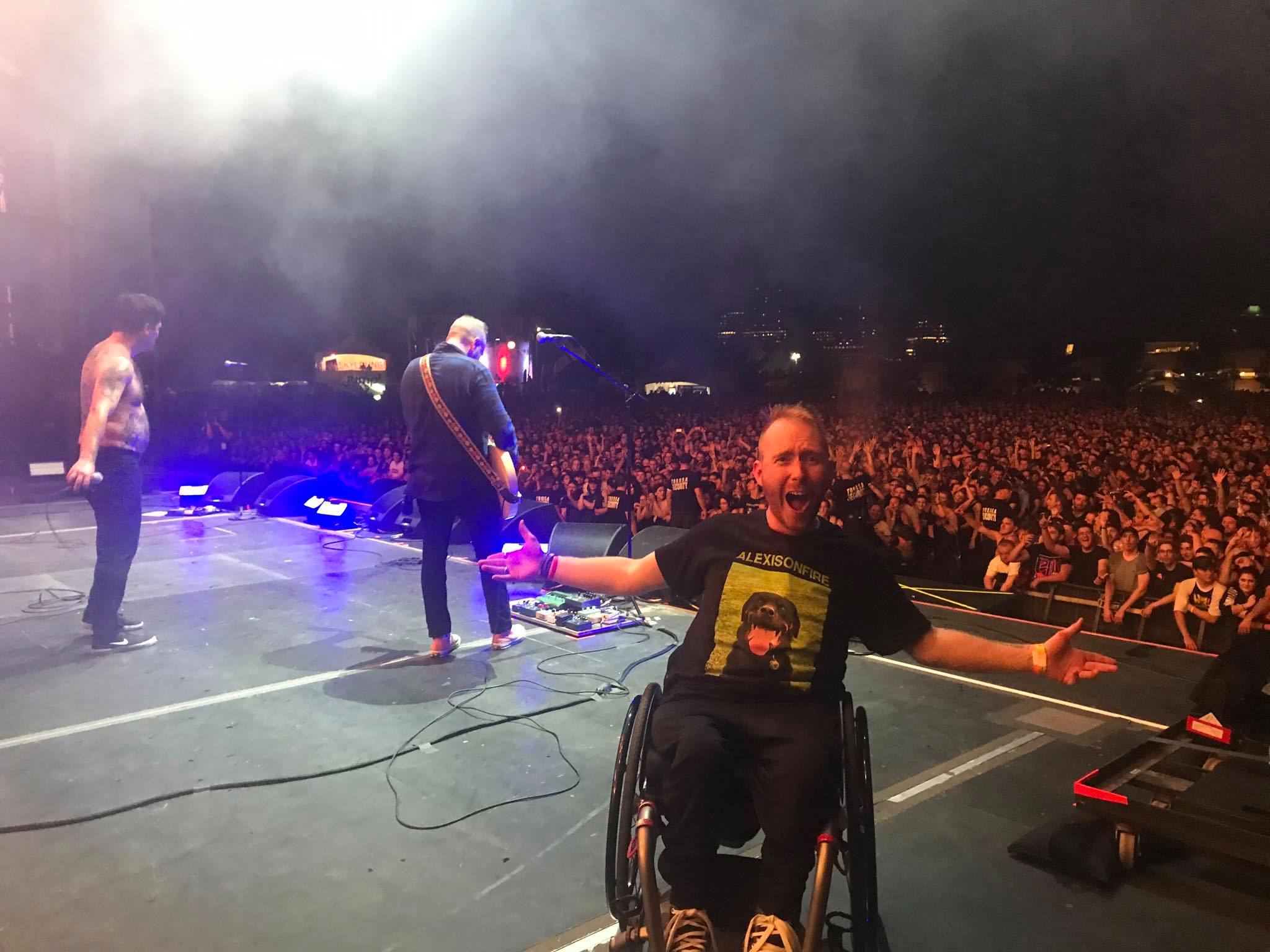 Kyle Humphrey, who uses a wheelchair, began his night at the festival watching The Offspring with some friends, who lifted him up into the air.