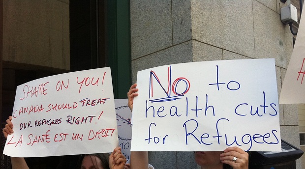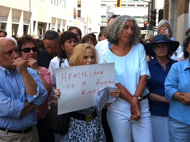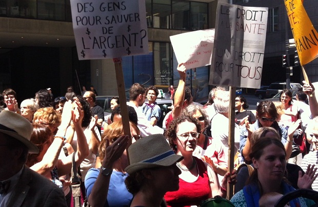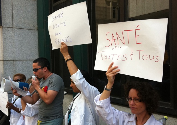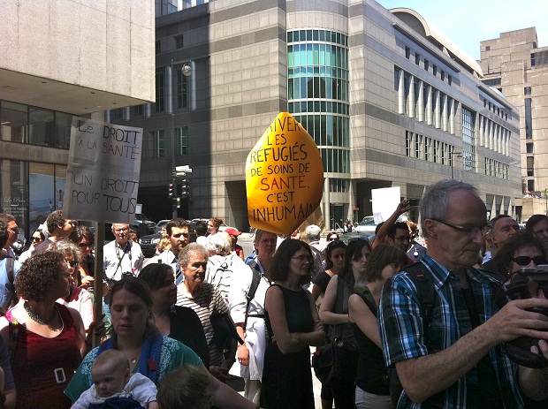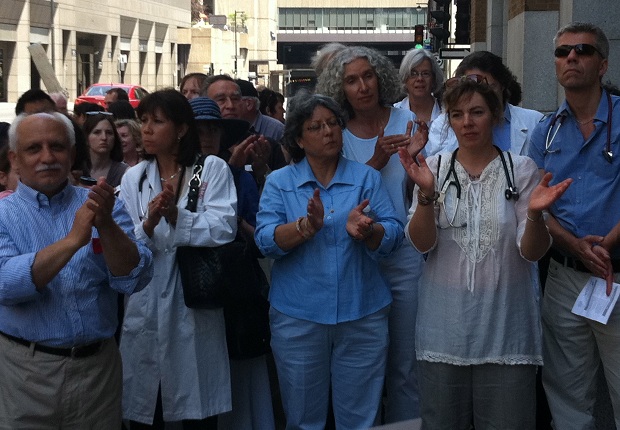 Medical practitioners gathered in front of the immigration office on St. Antoine in Montreal on June 18, 2012. They were protesting cuts to healthcare for refugees as part of a National Day of Action, where Canada’s physicians and other healthcare professionals were demonstrating across the country. The healthcare changes are scheduled to come into effect as of July 1, 2012.