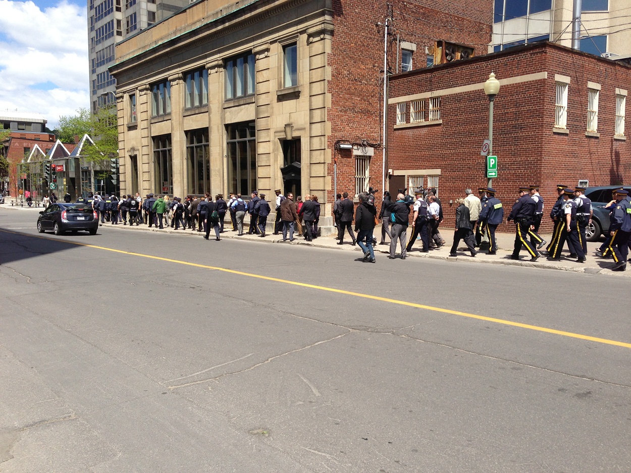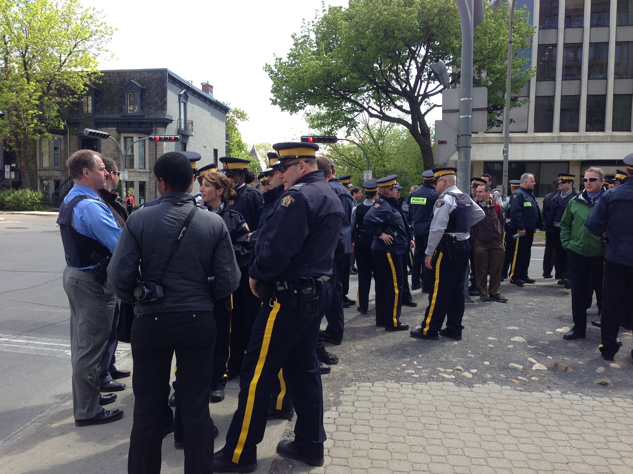 Demonstrators gathered at noon in front of RCMP headquarters in Westmount and then marched to the Atwater metro station, where officers took the subway to the Hyatt Regency Hotel to attend a meeting with management.
