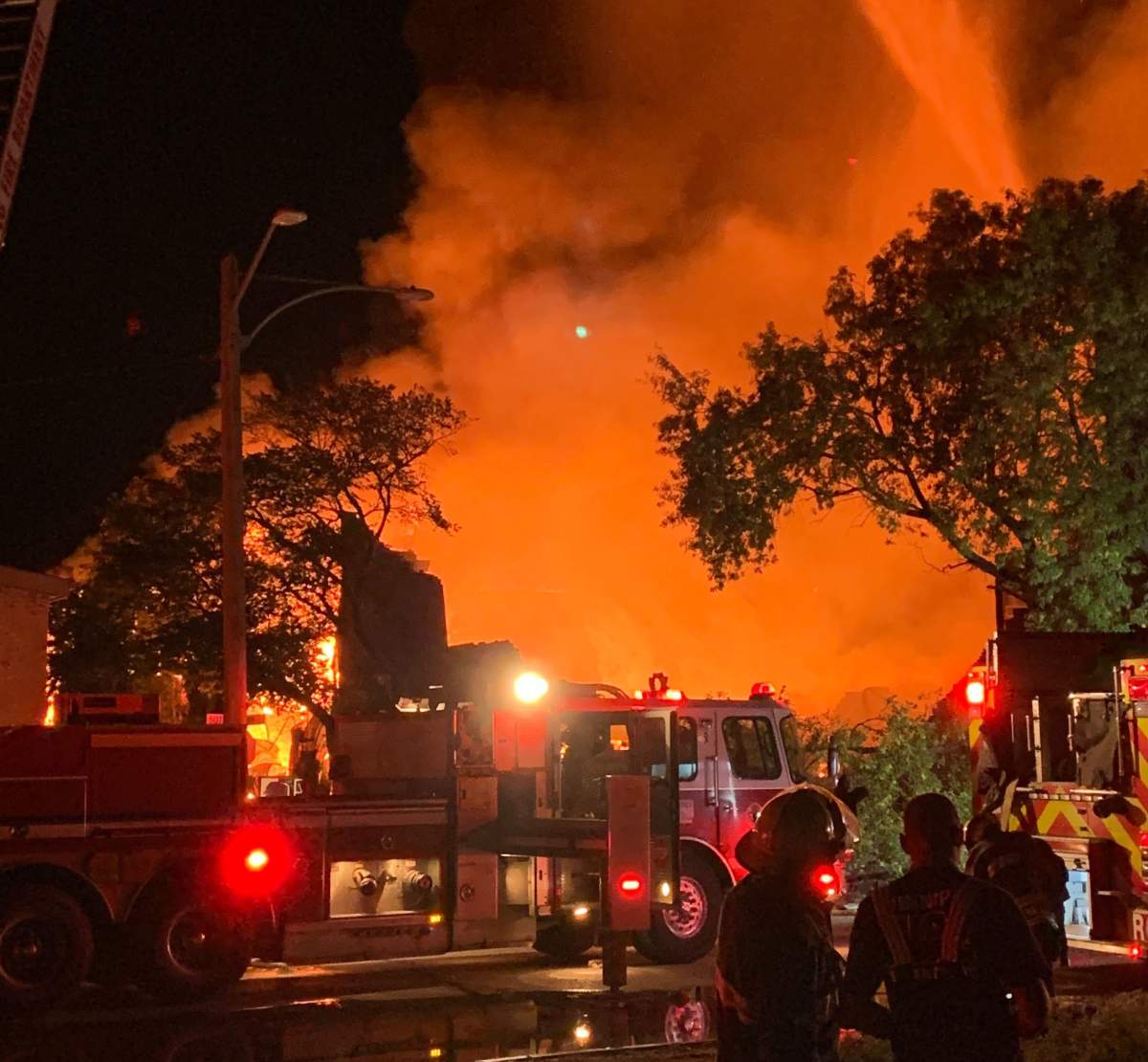 Multiple fire trucks are being used to battle the blaze including an aerial ladder.