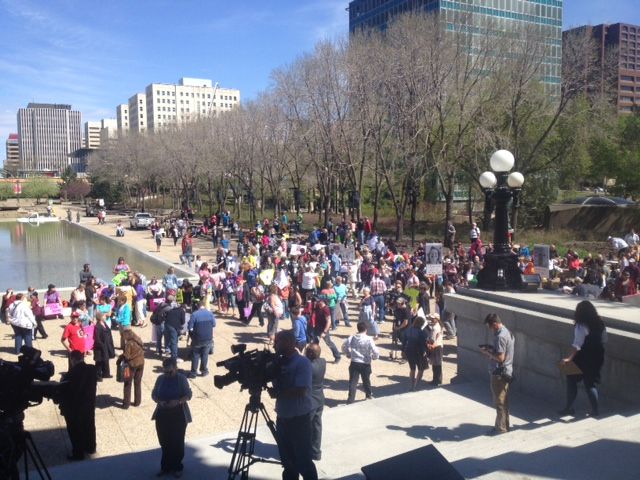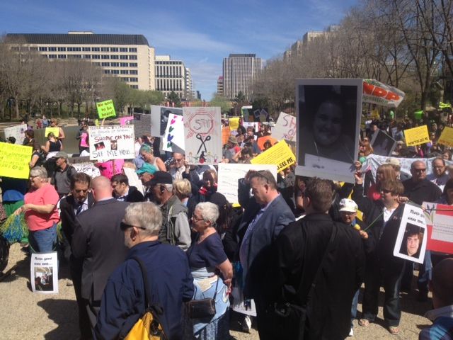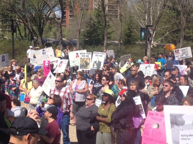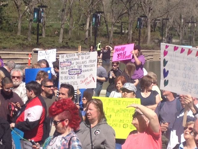 EDMONTON – Holding signs and chanting “stop the cuts,” and “shame on you,” hundreds of Alberta’s most vulnerable citizens and their supporters made themselves seen and heard in front of the Legislature Wednesday afternoon, as they protested cuts they fear will be devastating.