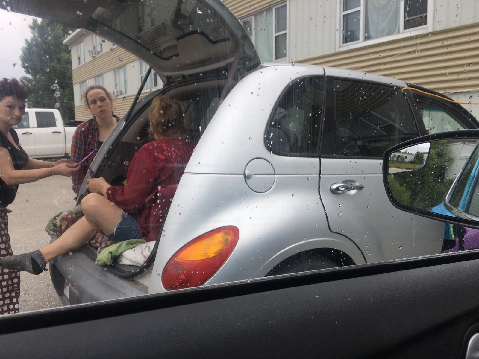 Three of the residents waiting outside of the fire-affected building in a car. Megan Yamoah/Global News