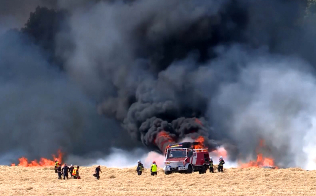 A fire truck burst into flames while fighting a blaze in a field near Rue de Hamm, Luxembourg, on Thursday.