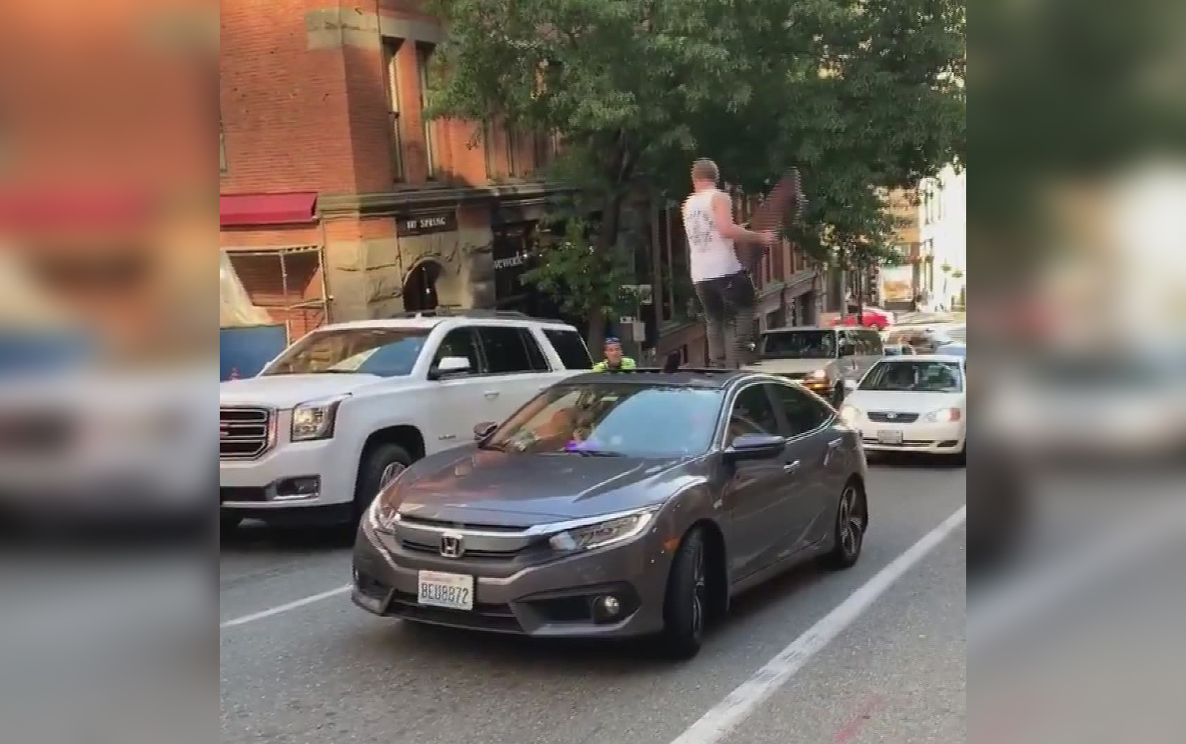 Finally, the man allegedly jumped on top of a Honda Civic, where he ripped the sunroof window out of the car’s roof and jumped down to the street.