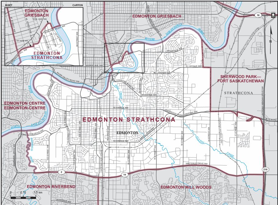 Edmonton Strathcona is a riding in central Edmonton, just south of the river, which includes the University of Alberta and Whyte Avenue areas.