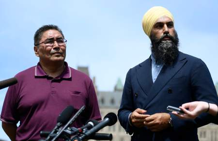 NDP leader Jagmeet Singh, right, and Chief Rudy Turtle of the Grassy Narrows First Nation listen to questions during a press conference announcing his candidacy for the NDP in Kenora, Ont. for the fall election, on the lawn of Parliament Hill in Ottawa on Monday, July 29, 2019. THE CANADIAN PRESS/Justin Tang