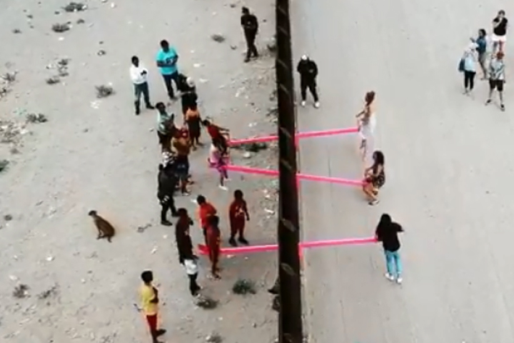 The seesaw exhibit was designed by Ronald Rael of UC Berkeley and his wife Virginia San Fratello of San Jose State University. They brought their neon pink seesaws to a stretch of the border wall and slid them between the metal slats for anyone to use.
