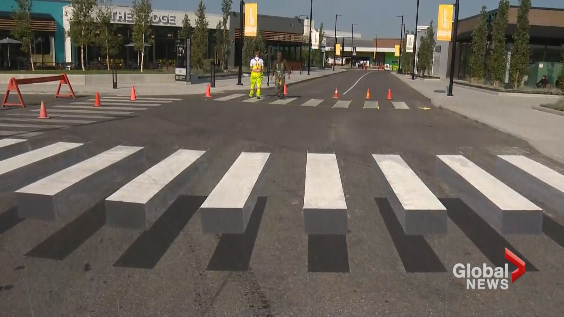 Crews were painting the finishing touches on some unique crosswalks at Calgary’s Deerfoot City shopping district on Wednesday afternoon.