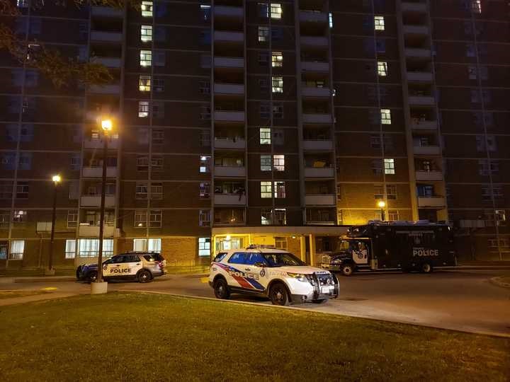Police say officers were called to a building near Jane Street and Falstaff Avenue for reports of gunshots a little after 1 a.m.