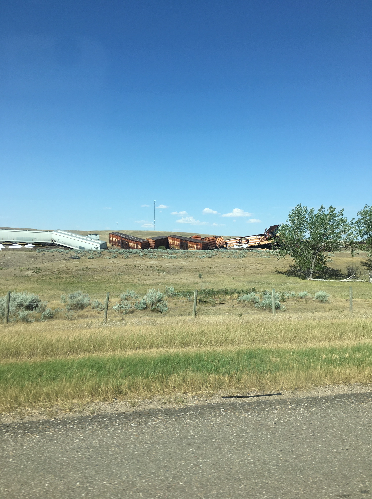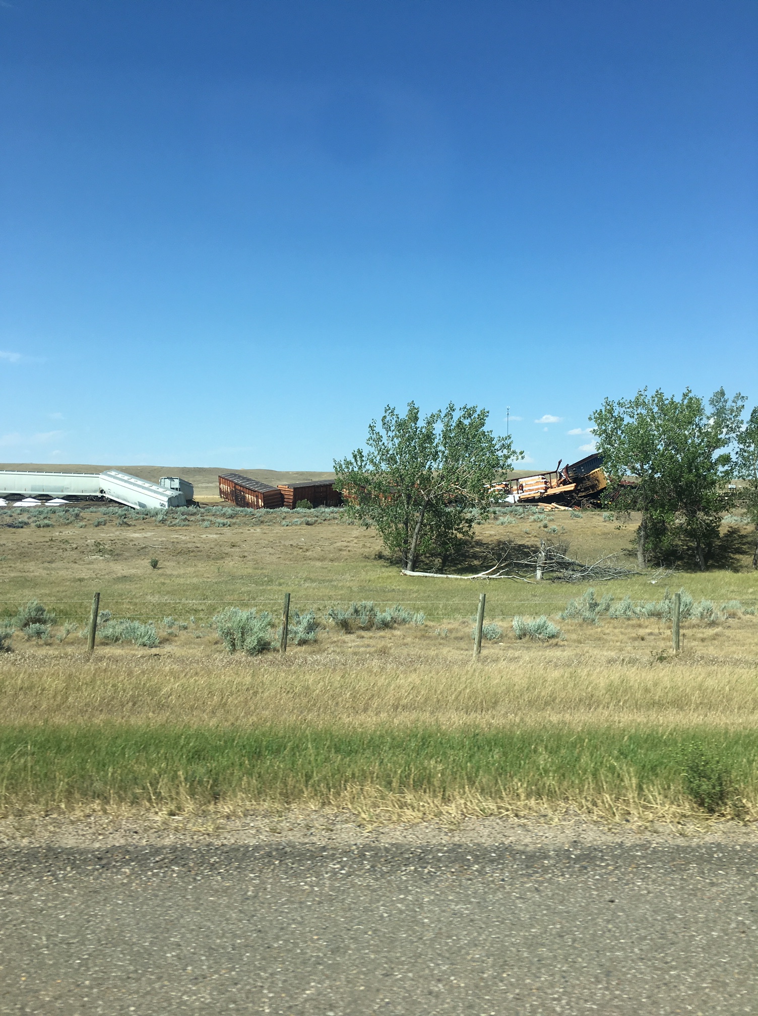 Fry, who passed the scene on her way to Calgary, said the train cars were about 500 metres from the side of Highway 1 on tracks that appeared to be running parallel.