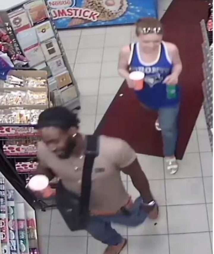 The female suspect is described as white, about five feet, eight inches tall with a slim build and in her mid-to-late 20s. She has long brown straight hair and was wearing a Blue Jays tank top, blue jeans and white sandals.