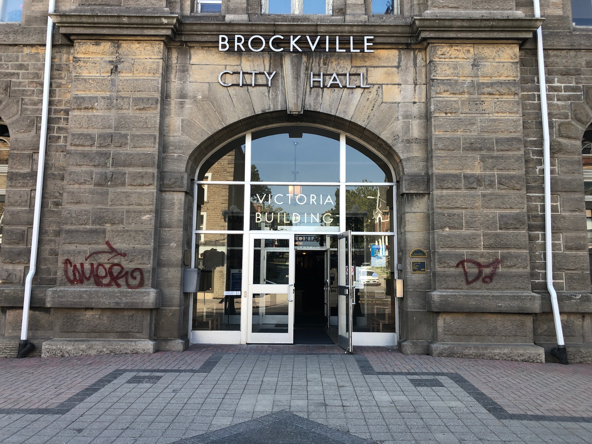 Brockville Police are looking for suspects after several buildings were targeted with graffiti over the weekend, including historic Brockville city hall.