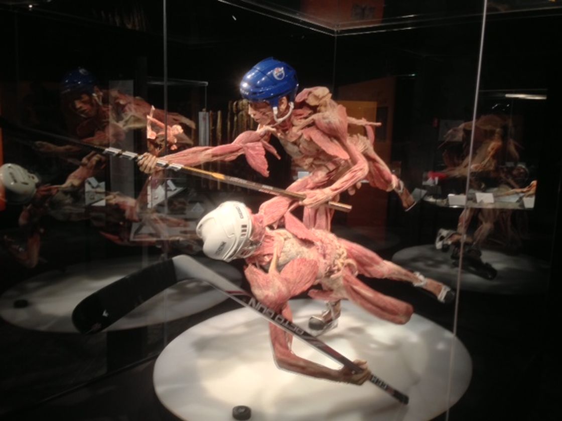 Individual organs and systems are also part of the exhibition. The 20 full-body plastinates are displayed in various action poses, including hockey players, a baseball player, a ballet dancer, ice skaters, and a woman executing a yoga pose.