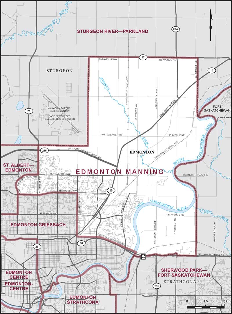 A new riding as of 2015, Edmonton Manning was made up of parts of the Edmonton East, Edmonton-Sherwood Park and Edmonton-St. Alberta ridings.