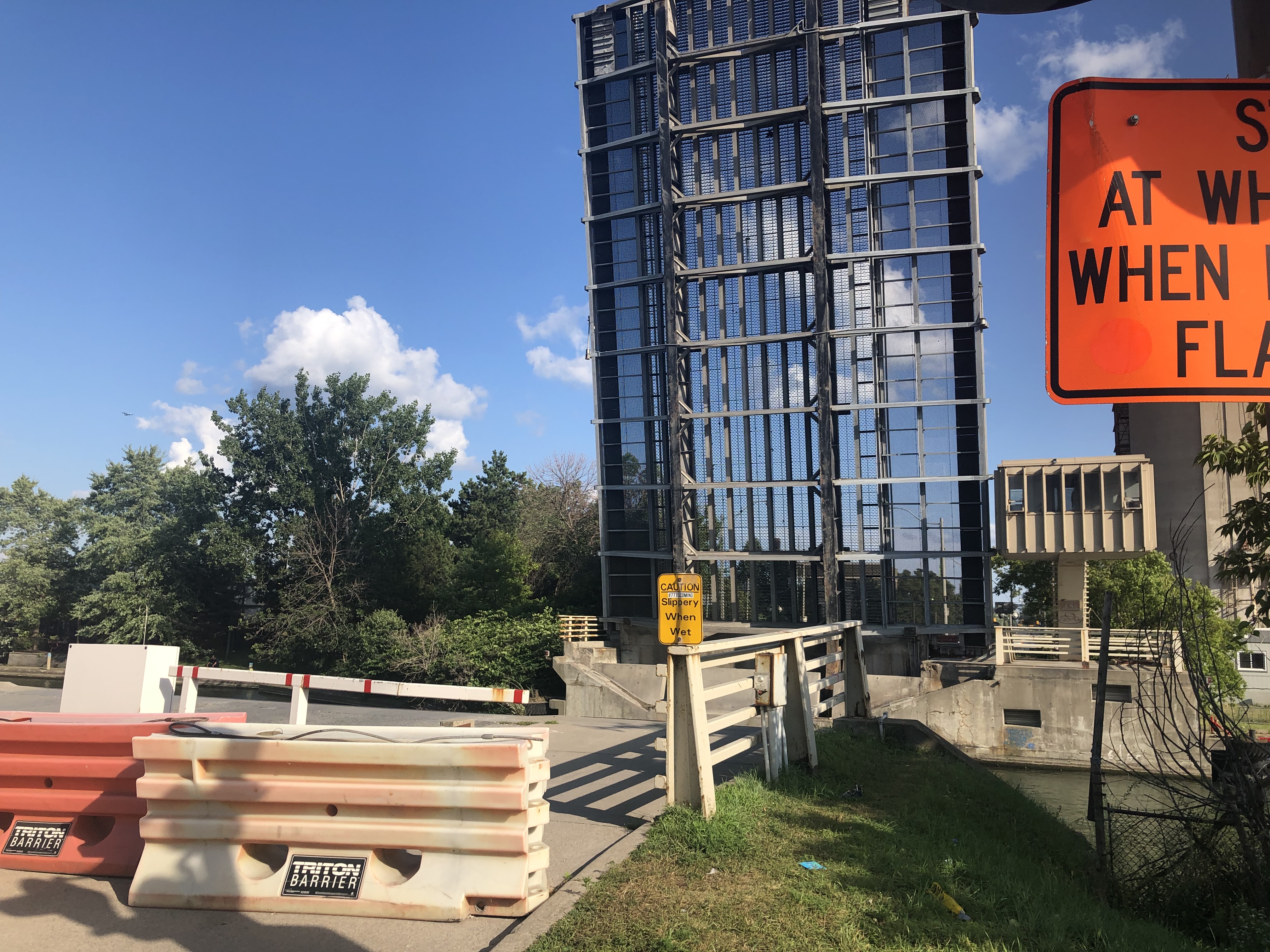 The bridge in Toronto’s Lower Donlands has been impassable since Aug. 1 when, according to the city, mechanical and electrical failure caused it to jam at its present position.