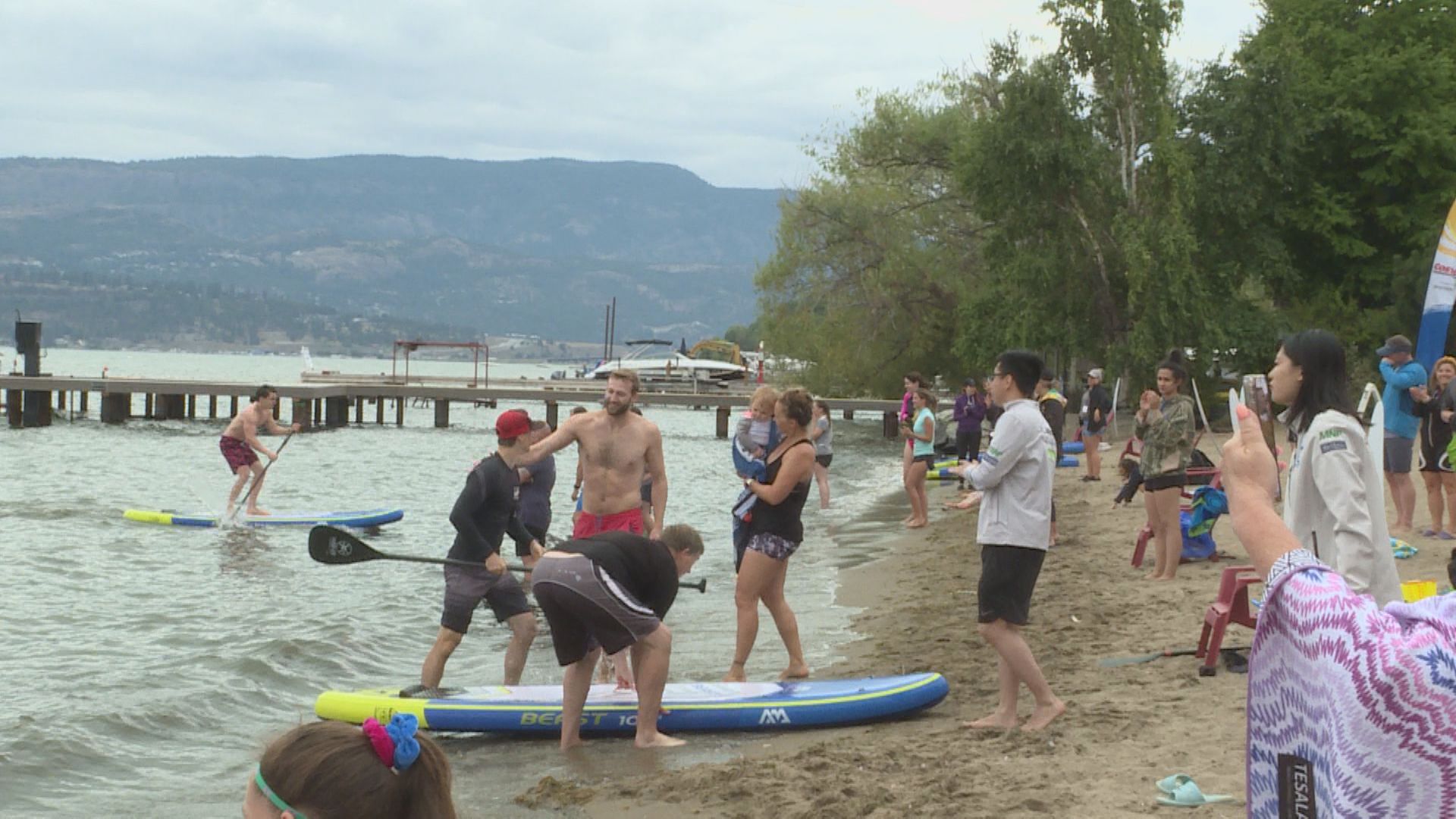 Hundreds gathered at the shores of Rotary Beach in Kelowna on Sunday to cheer on costumed paddleboarders racing for a good cause.