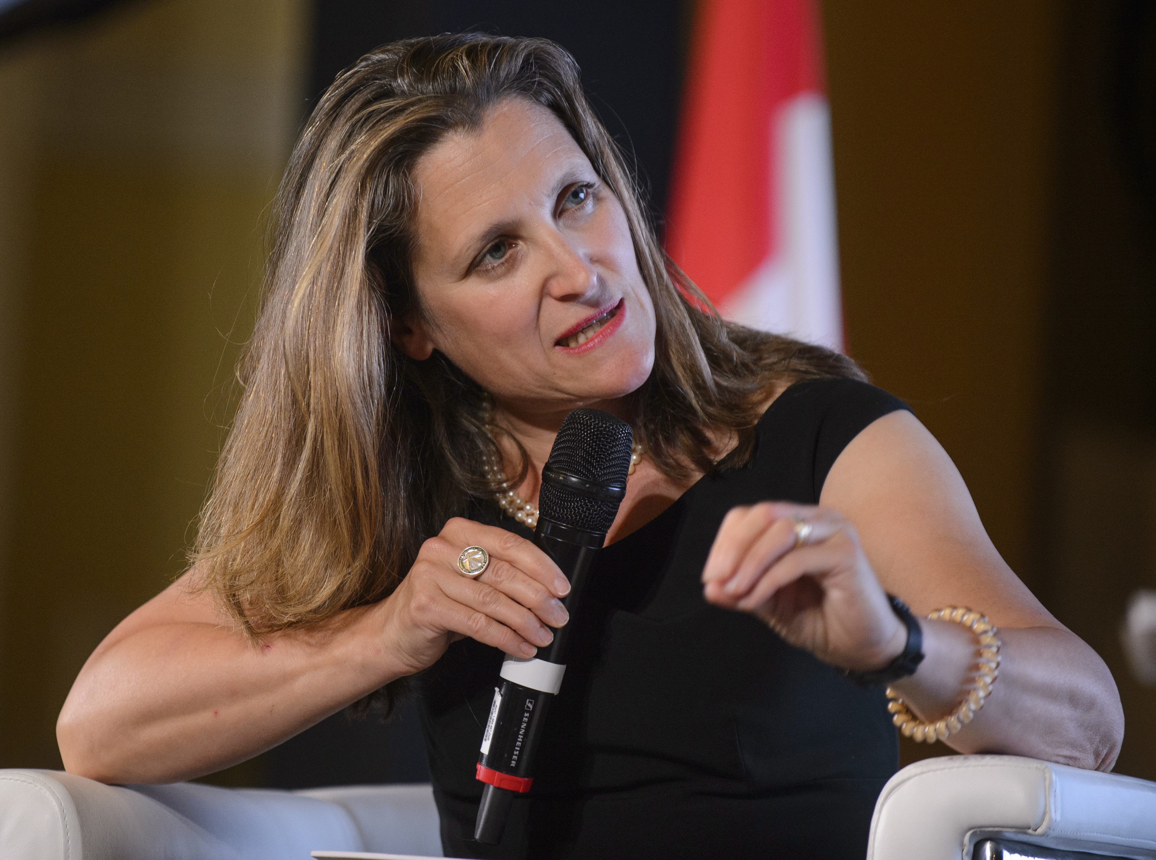 Chrystia Freeland told reporters that government officials should be talking about the arbitrary detention of the two Canadians when meeting with their Chinese counterparts.