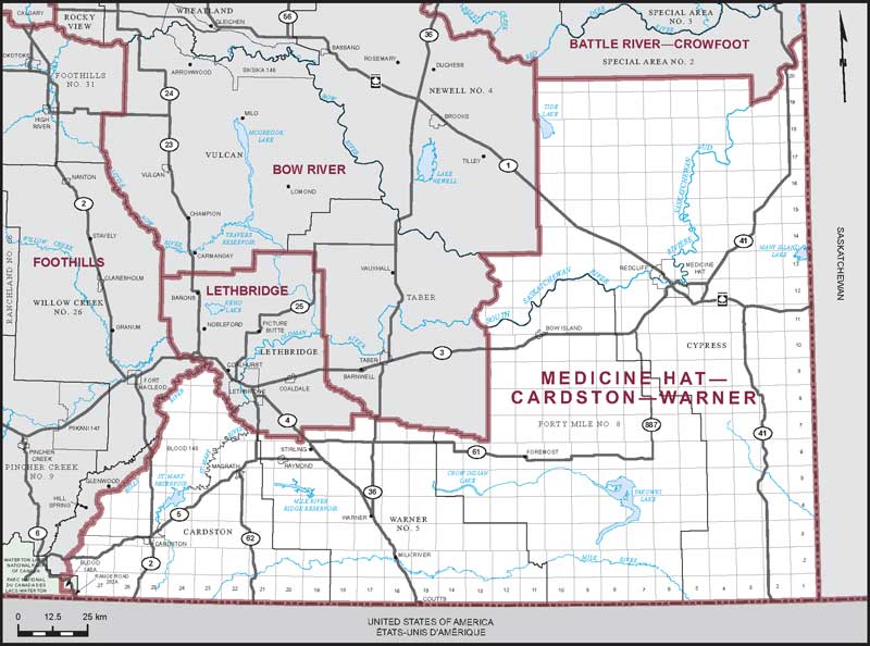 The Medicine Hat-Cardston-Warner riding in southern Alberta encompasses the City of Medicine Hat, as well as the communities of Cardston, Magrath, Raymond, Bow Island, Redcliff, Warner, Coutts, Milk River and Foremost.