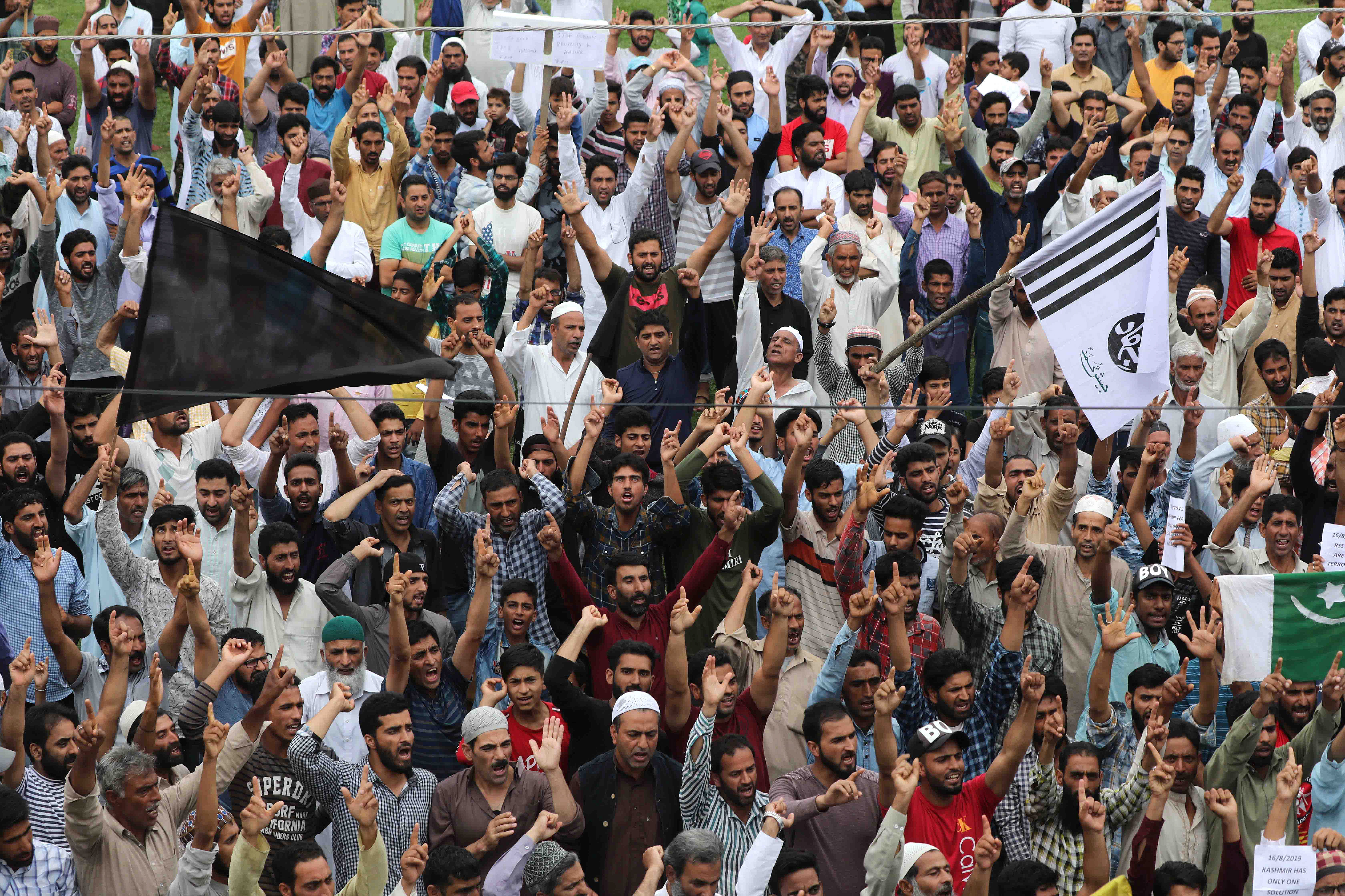 Young and old demonstrators took to the streets in Srinagar, the region’s main city, after Friday prayers. They carried green Islamic flags and signs reading “Stop Genocide in Kashmir, Wake Up World.”
