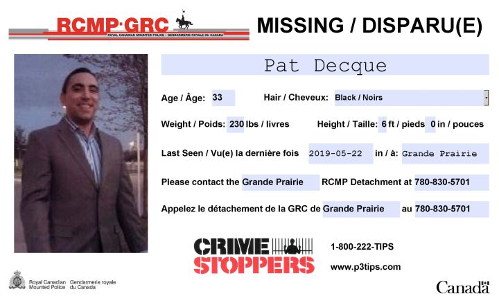 Anyone with information about Decque’s whereabouts or disappearance is asked to call the Grande Prairie RCMP detachment at 780-830-5701 or their local police department. Tips can also be anonymously submitted by phoning Crime Stoppers at 1-800-222-8477 or contacting them online.