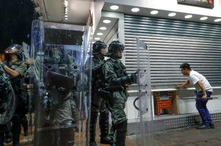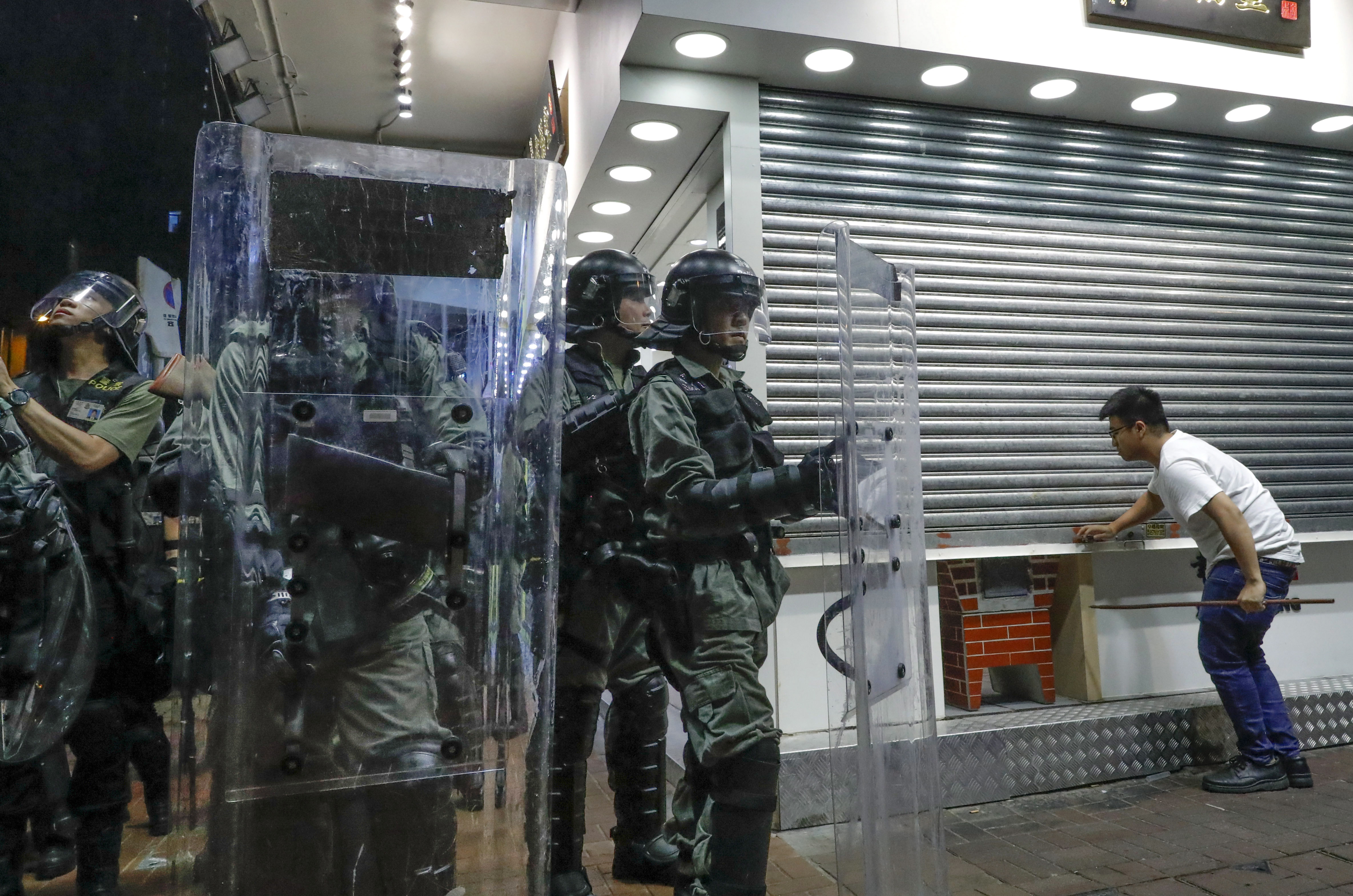 Members of China’s paramilitary People’s Armed Police force have been training this week across the border in Shenzhen, fueling speculation that they could be sent in to suppress the protests. Officers didn’t appear to hold major drills on Saturday, but could be seen doing jumping jacks and stretching inside a sports stadium. Dozens of army-green armored carriers and trucks were parked inside and outside the facility.